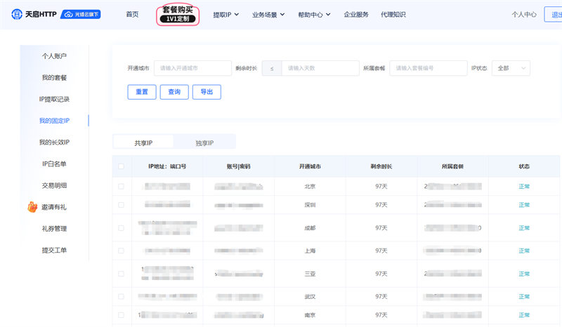 在配置之前,咱們得先做好準備工作。打開天啟HTTP代理官網,用手機號注冊賬號,新用戶還能領取免費試用額度,這一步就不多說了,跟著官網指引走就行。注冊完成后,在“個人中心”模塊,找到自己選擇的IP套餐,里面有代理IP地址、端口號和賬密等信息。